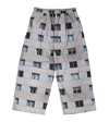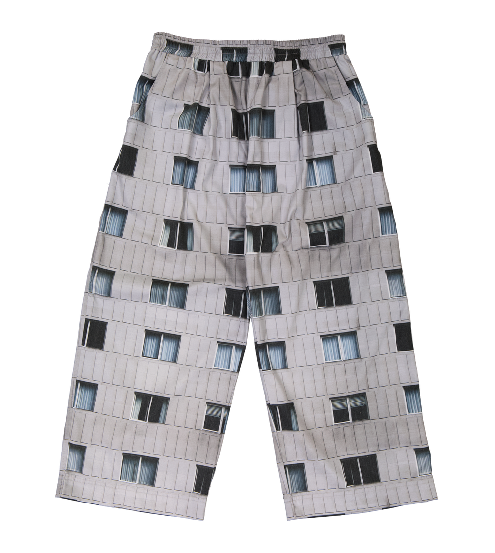 Made from a white Baby Gab fabric, these pants have been digitally printed with buildings, highlighting the windows, shapes and lines of architectural landscapes.