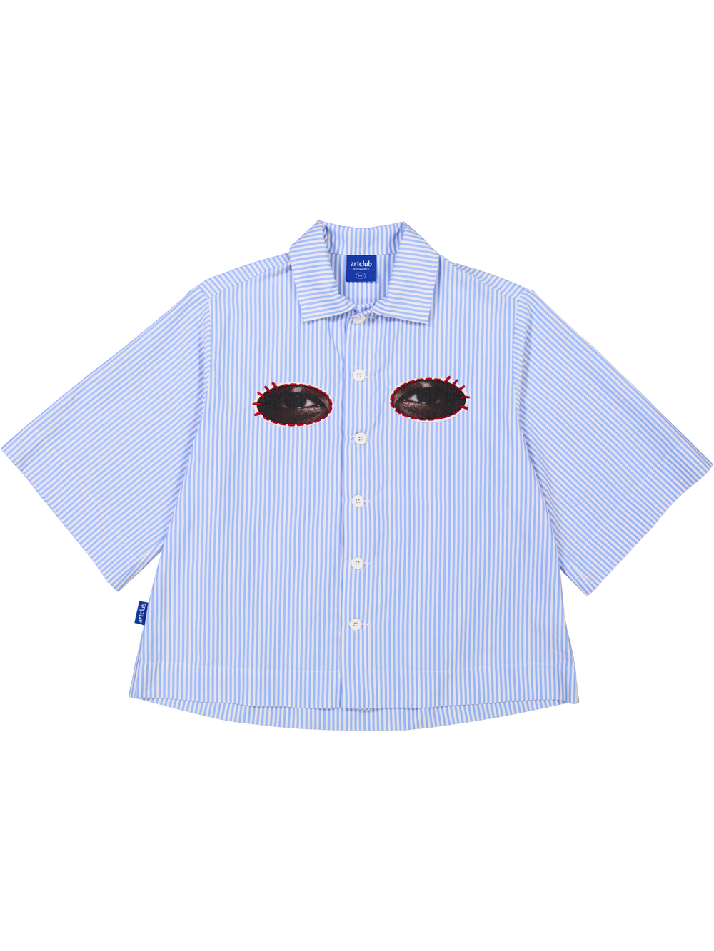 • Featuring a simple white button stand on the front, that can be buttoned all the way to the neck line, the art in this shirt is found in the embroidered eye work on the left and right chest.